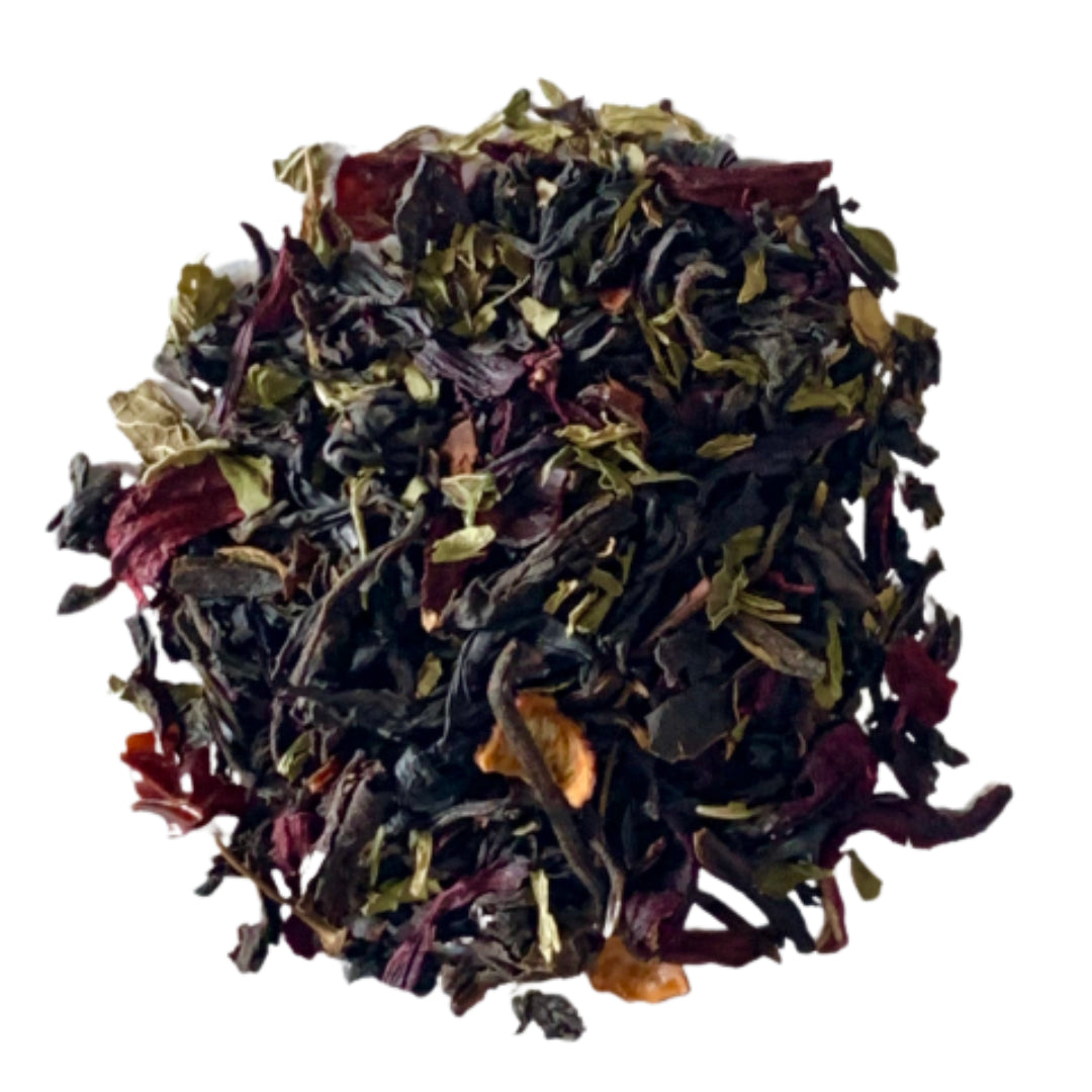 Ingredients: Black tea, Spearmint, Hibiscus, Rose Hips, Natural Raspberry Flavor
