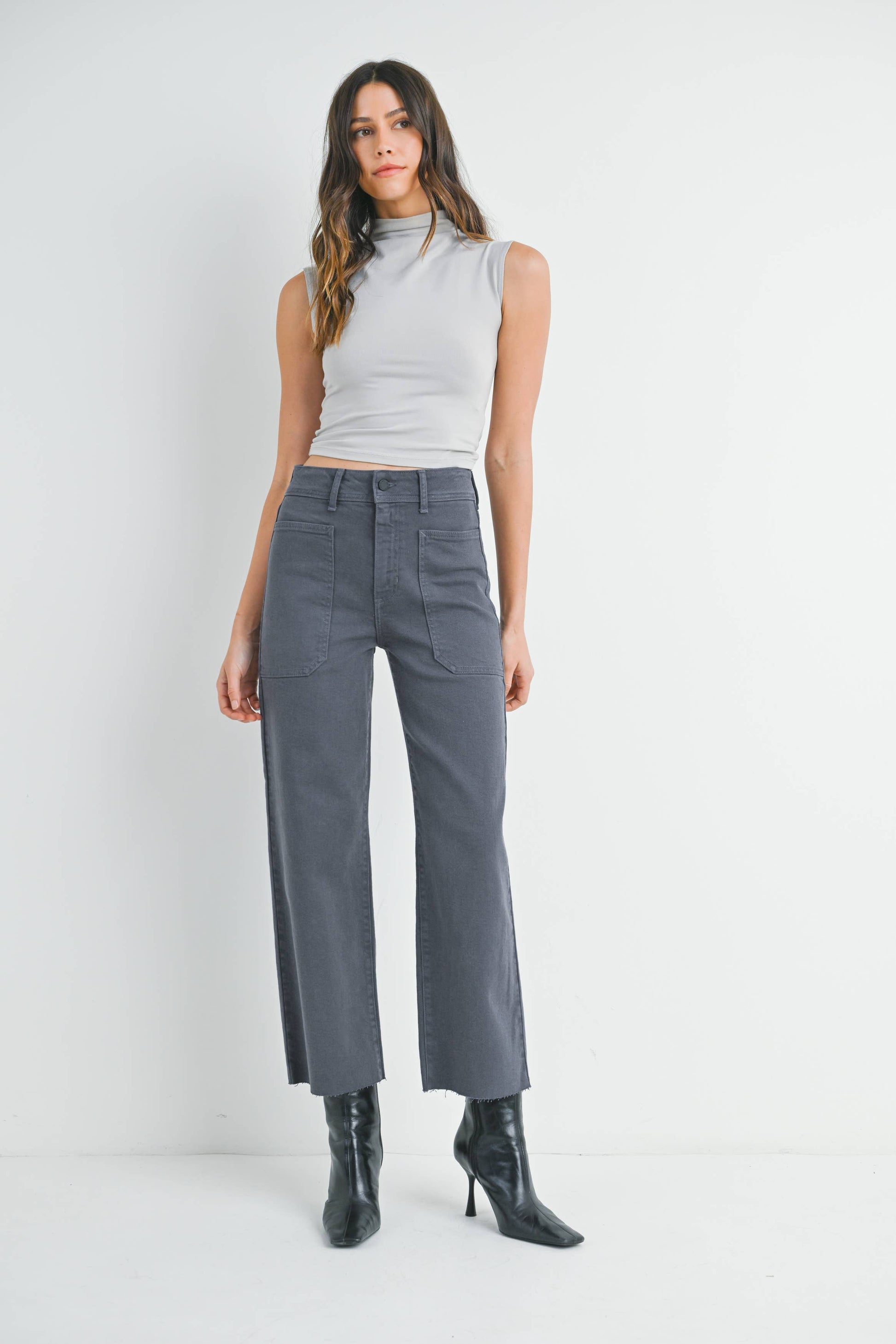 The Nautical Wide Leg Wide leg jeans are everywhere, shouldn’t they be in your closet? Get with the times and make a statement in the Nautical Wide Leg in off-white.11.5'' Rise, 27'' Inseam, 9.5'' Opening Charcoal - High Rise Wide Leg with Front Utility Detail Pockets