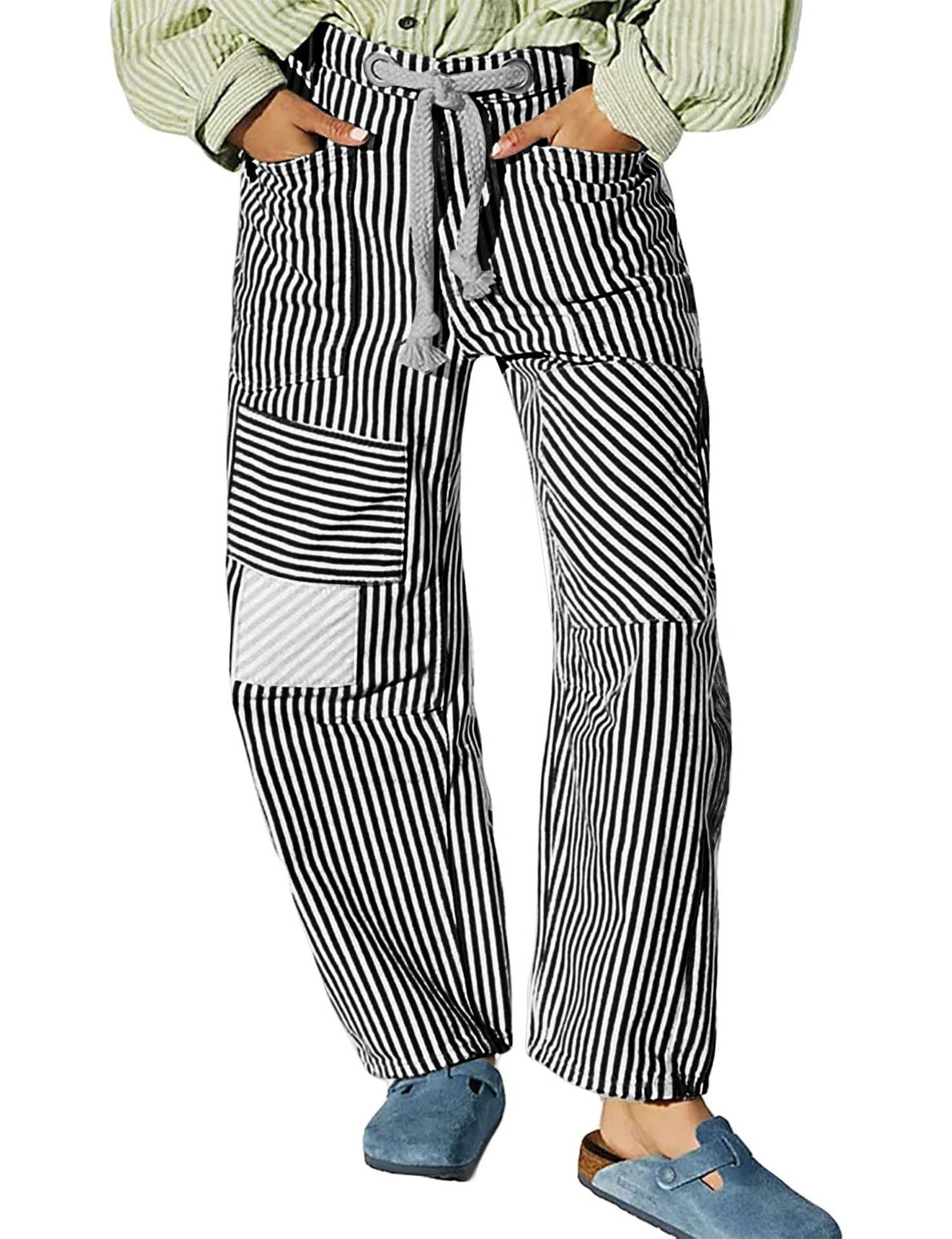 Striped Drawstring Pants - black and white
