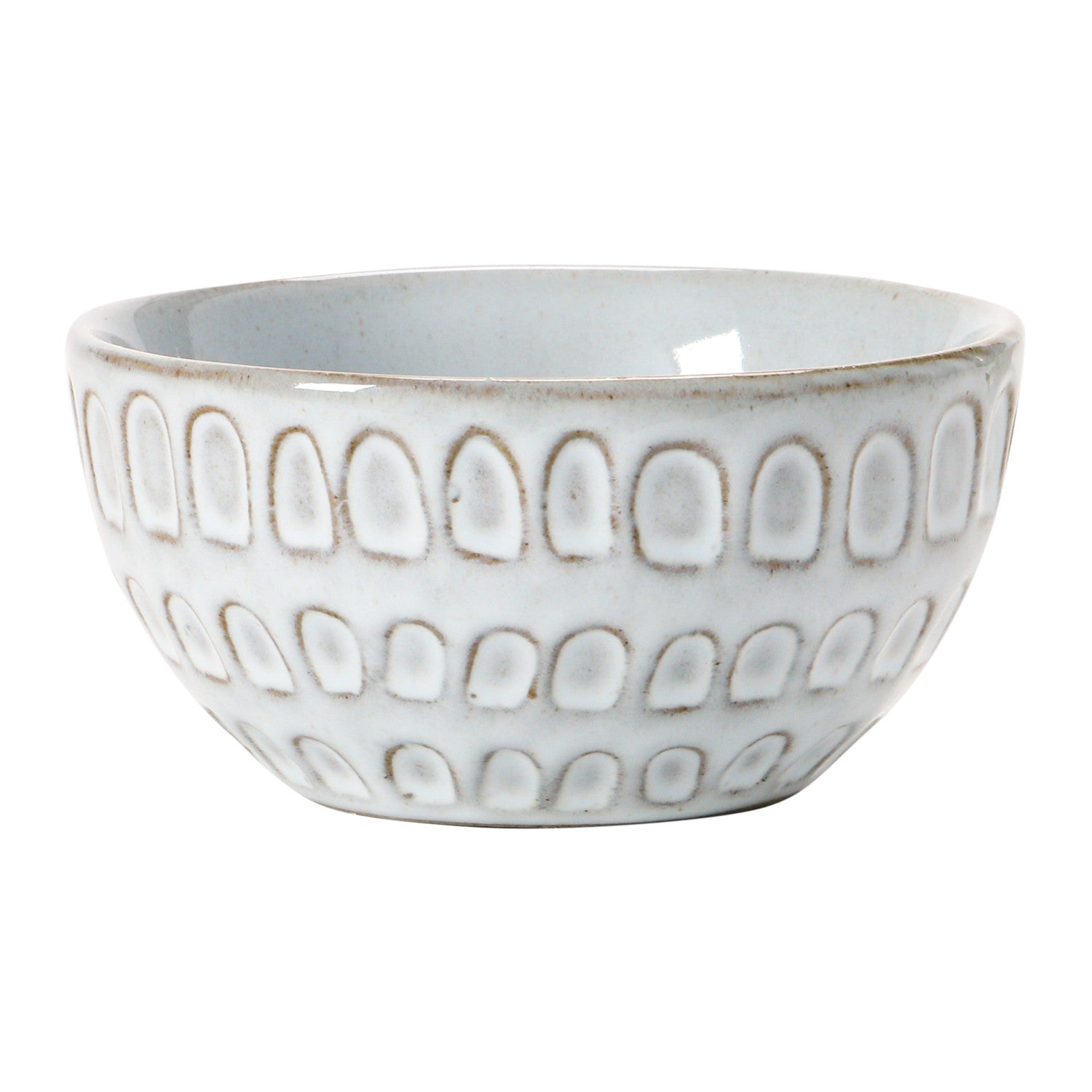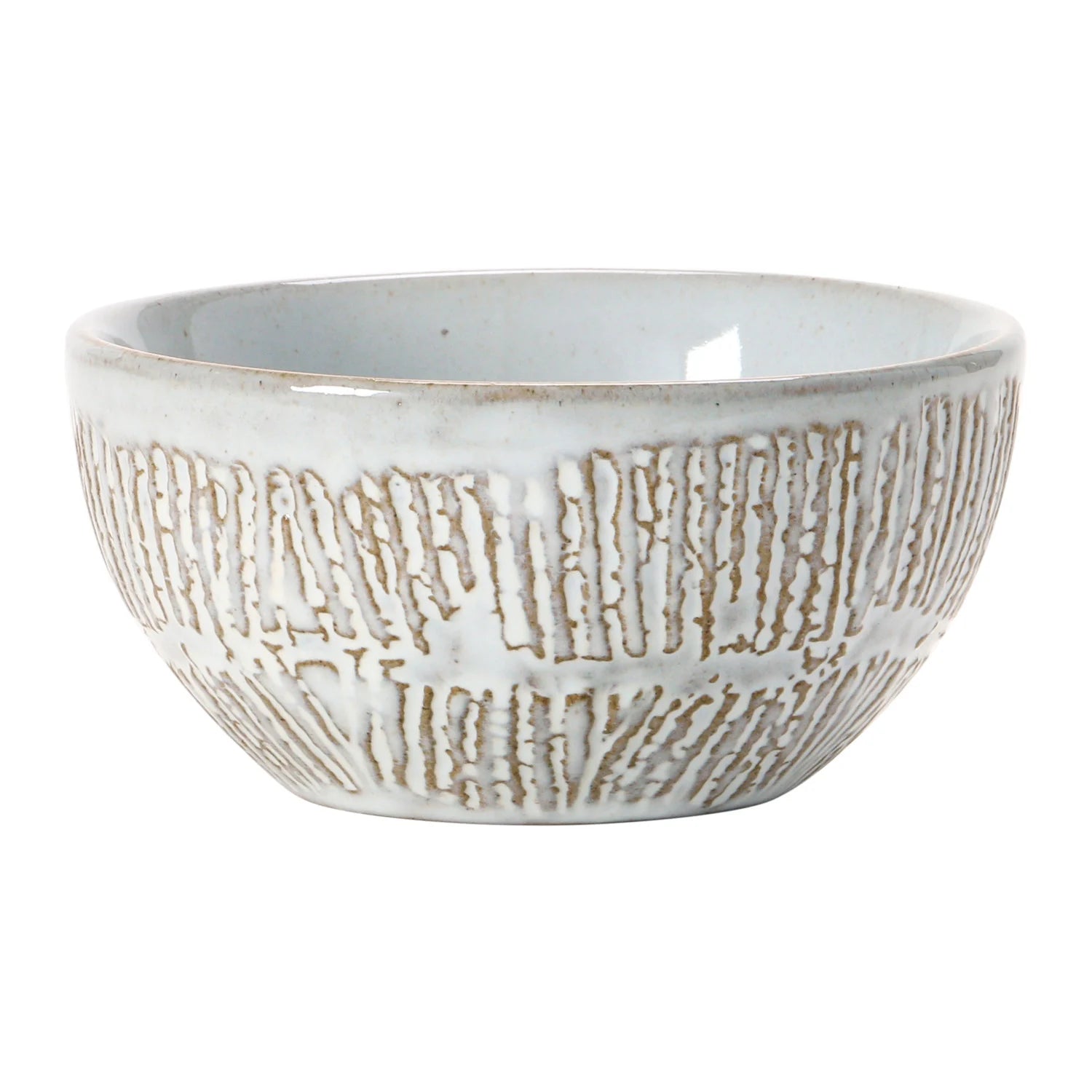 4" Round x 3"H Stoneware Bowl w/ Wax Relief Pattern, Reactive Glaze, White, 4 Styles (Each One Will Vary)