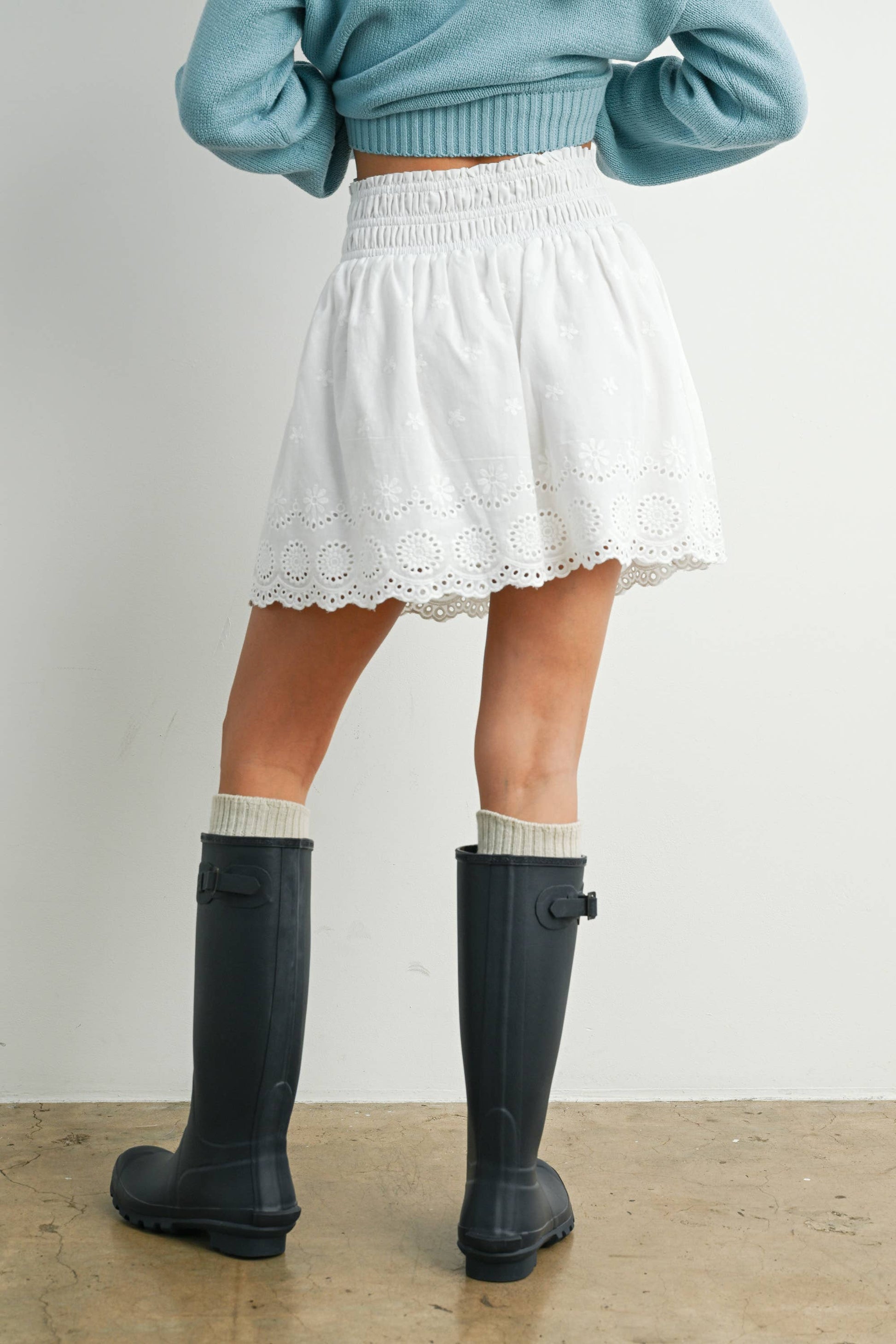 Elevate your style with this Eyelet Ruffle Smocked Skirt, The intricate eyelet pattern and playful ruffles add a touch of elegance, while the smocked waist ensures comfort and versatility.