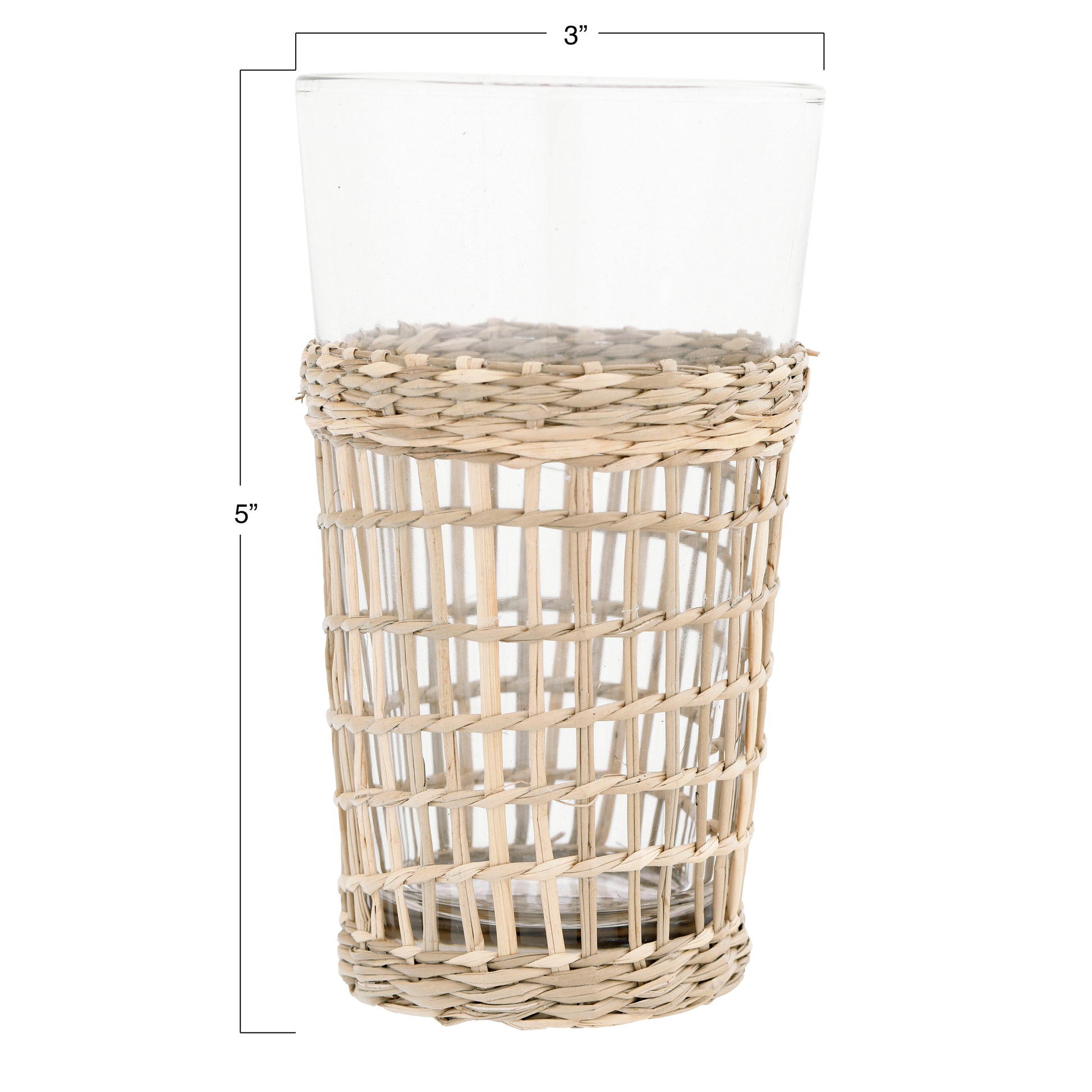 The tropical decor will welcome this clear 12 ounce drinking glass. It is decorated with a woven seagrass sleeve making this glass a perfect decorative accent. Pair with a seagrass bread basket and a woven seagrass centerpiece.