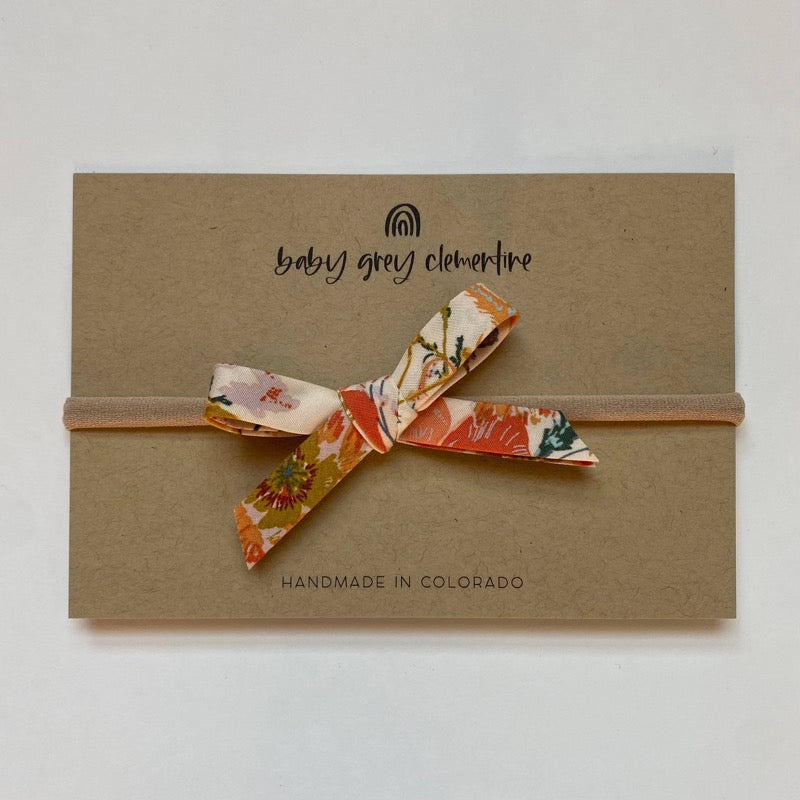 Baby Grey Clementine dainty bow head band hand tied by owner/designer, Randee Kildow. These are incredibly comfortable & will not leave any indentation! •Cotton •Double-layered with a finished edge •1/2 inch wide •Attached to a one-size-fits-most nylon headband Please note colors may differ slightly due to monitor variations. Fabric bows may have slight variations in shown patterns as they are all handmade. Contains small parts, adult supervision advised.