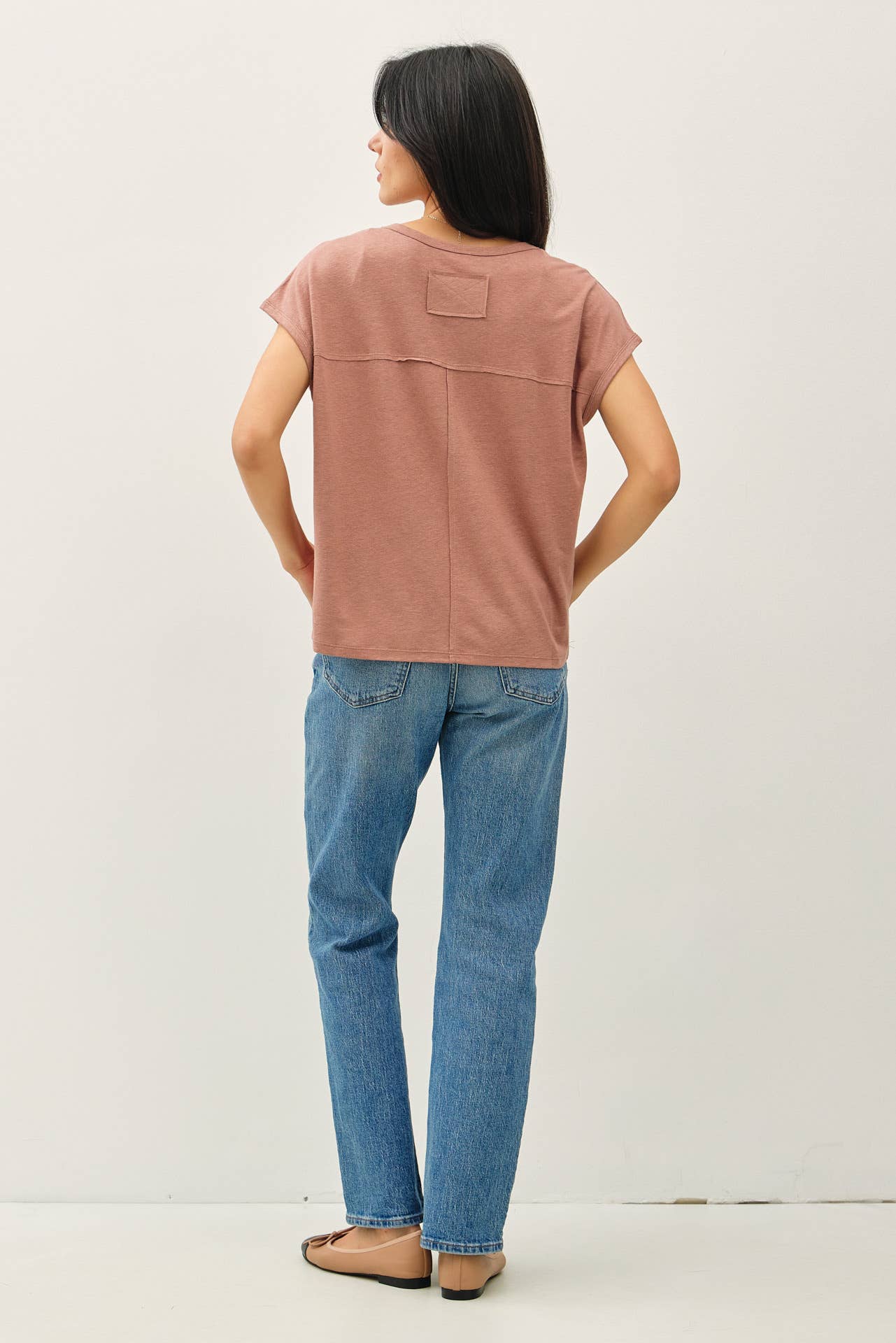 Basic knit tee with cap sleeve. Rounded neck, hip length. Exposed seam detail - this is an everyday essential.