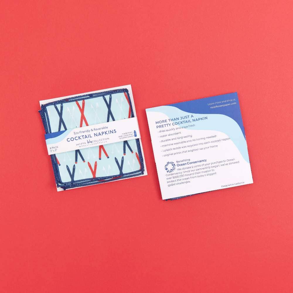 Uber-sustainable high-performance microfiber reusable Cocktail Napkins are made from reused recycled plastic bottles. Each set is 8 napkins with reversible designs. DETAILS • super absorbent microfiber • 5 x 5 inches • ultra-soft • dries quickly • durable • Set/8 reversible cocktail napkins •