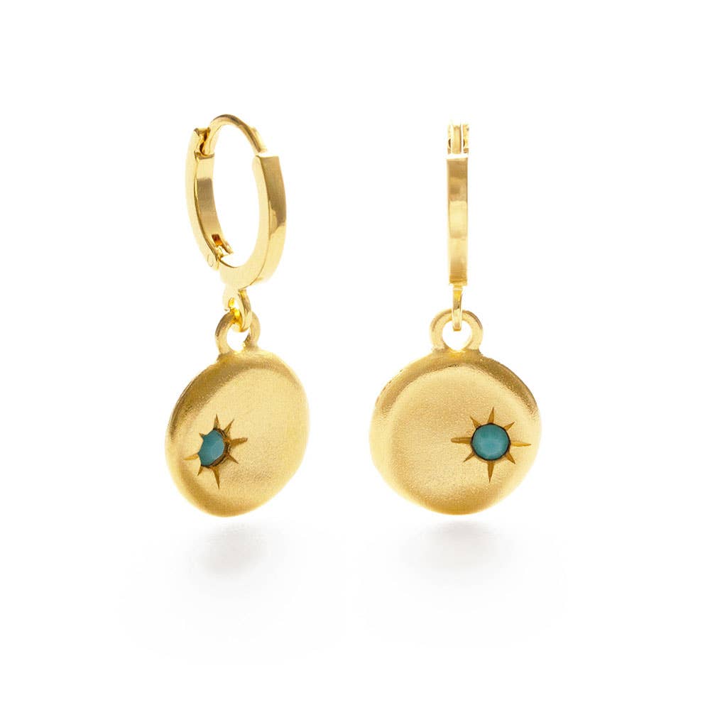 The North Star is often used as a symbol for a beacon of destiny and fulfilling dreams. These organic form coins set with Czech crystals measure just under .5" and they hang from 14mm huggie hoops. Made of 14k gold plated brass.