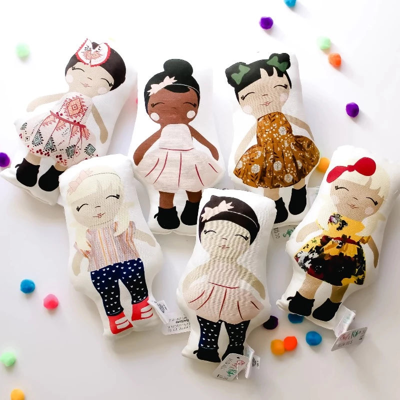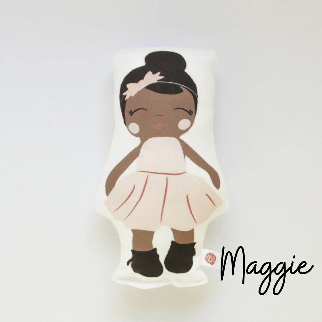 These sweet pillow dolls are approximately 10 inches tall and perfect for on the go or as a gift.