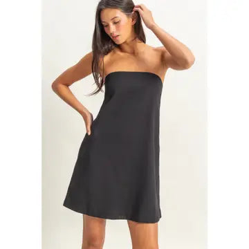 You'll Be Looking Your Best This Summer, Thanks To This Mini Dress. This Sand Washed Dress Has A Strapless Neckline And A Straight Silhouette. Turn Around To Reveal An Elasticized Strap With A Cutout Below It.