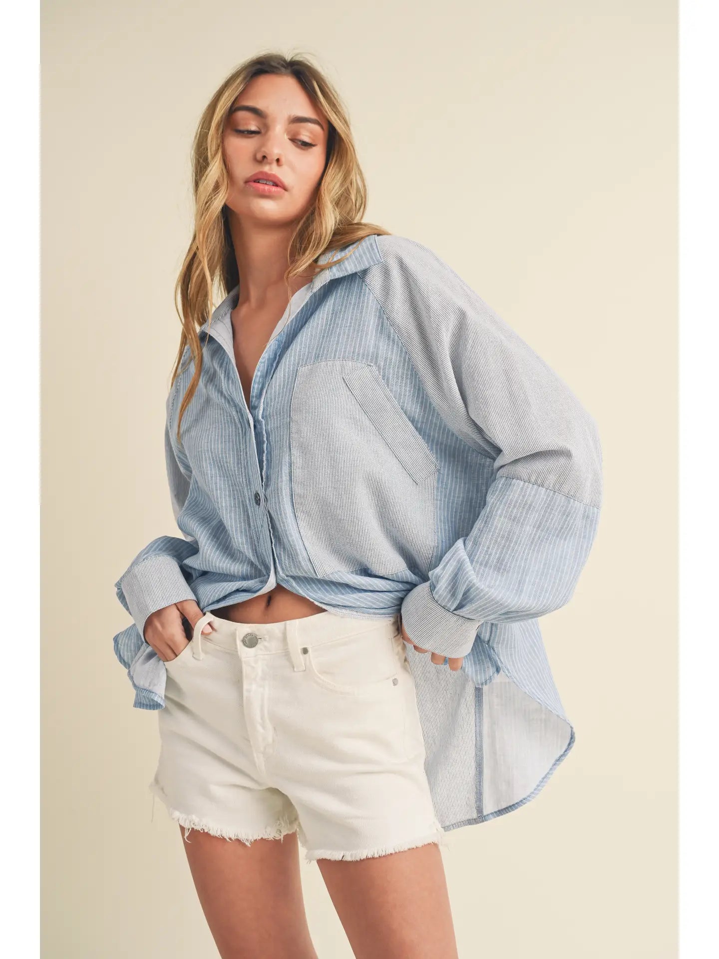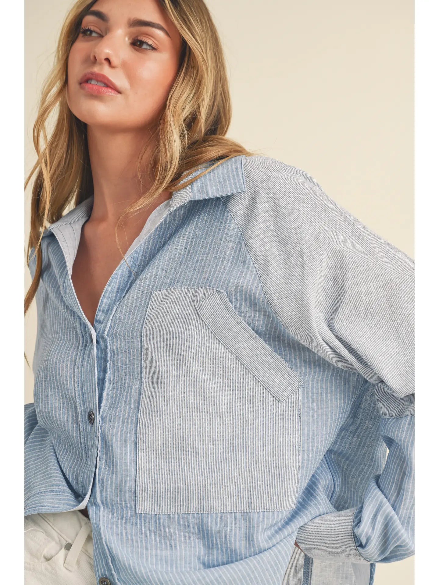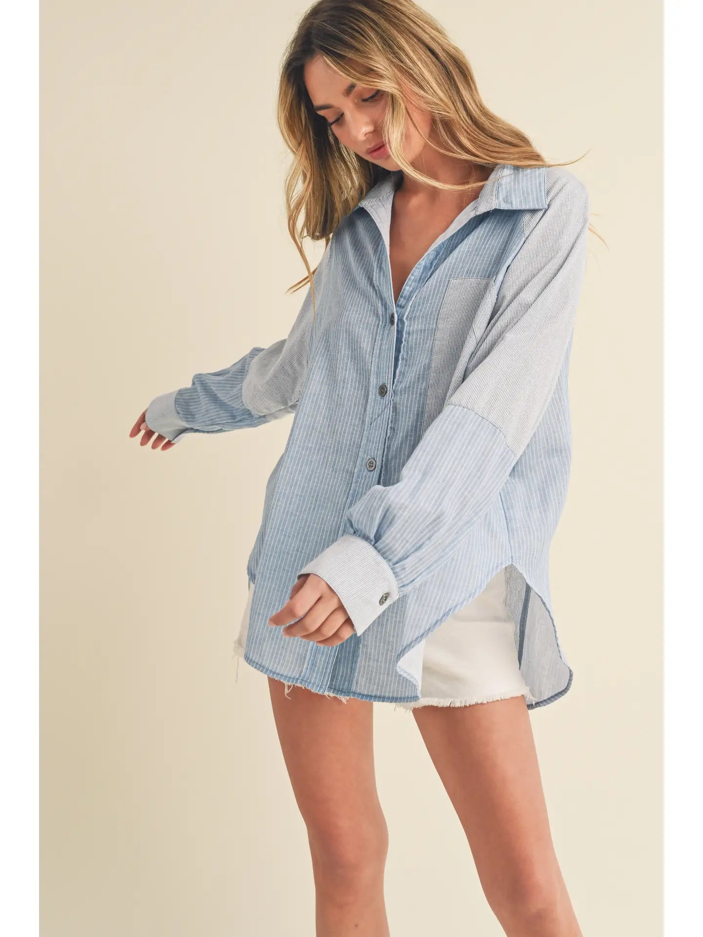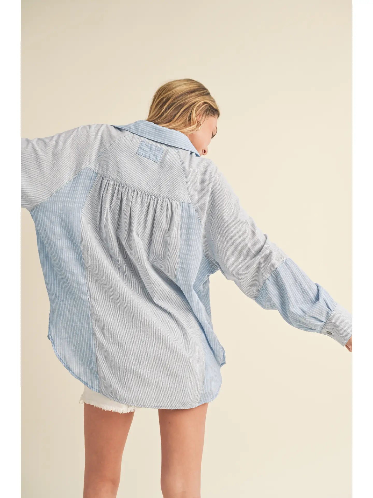 Shia button-down is a stylish variation of the classic button-up shirt, featuring panels or sections of different fabrics or textures strategically placed for a unique and eye-catching design.